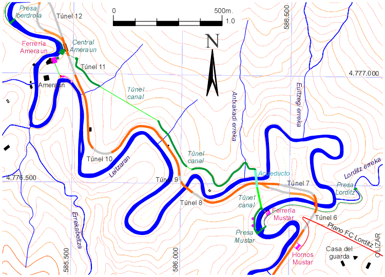 Canal de Lorditz - Derivación de la presa: por la margen izquierda. Sección: 50 cm de sección libre cuadrada, cerrado por losetas de arenisca. Longitud: 570 metros. Final: desagüe en remanso en la presa de Mustar. Otros: lámina de agua libre, salvo en su cruce con el ferrocarril de Plazaola (junto a la boca norte del túnel 6), que se realizaba por medio de un sifón. Este sifón ya no existe (primeros 80). En su parte final este canal coincide con el trazado del canal de la ferrería de Mustar. El canal se encuentra abandonado desde antes de 1970, y está bastante deteriorado.