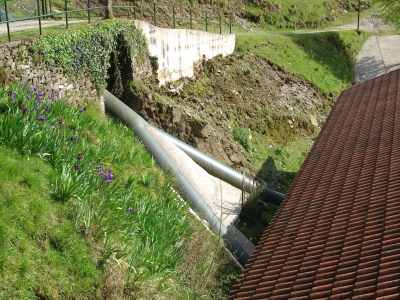 Tubería forzada - Longitud: 80 metros. Renovada en 2001/2002. En el tramo inferior, comprendido entre la explanación del Plazaola y la Central, se ha bifurcado la tubería (una Y invertida).