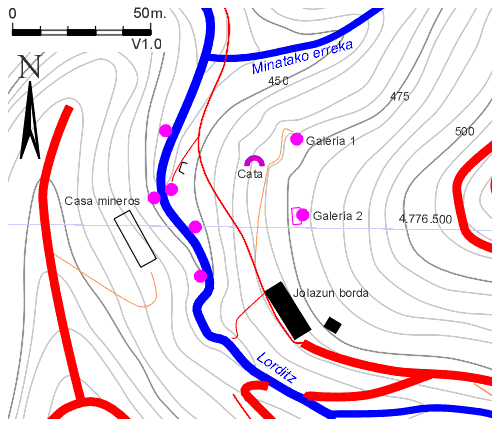 Bocaminas situadas en Lorditz, cerca de la confluencia del arroyo del mismo nombre con Minatako erreka.