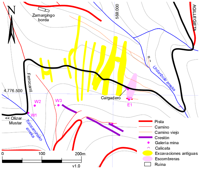 Continuando por esta pista (visiblemente horizontal) llegamos a Tolosamina erreka, donde nos encontramos ya con una bocamina, y tras sobrepasar una aguda curva a la derecha llegamos a la zona de explotaciones a cielo abierto.